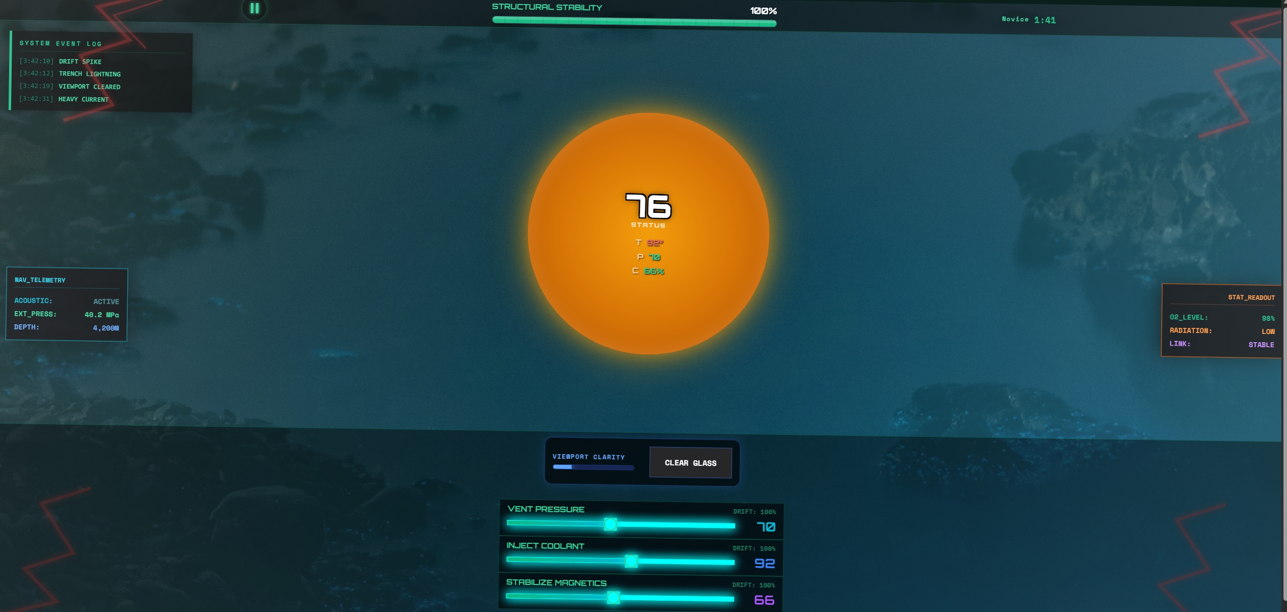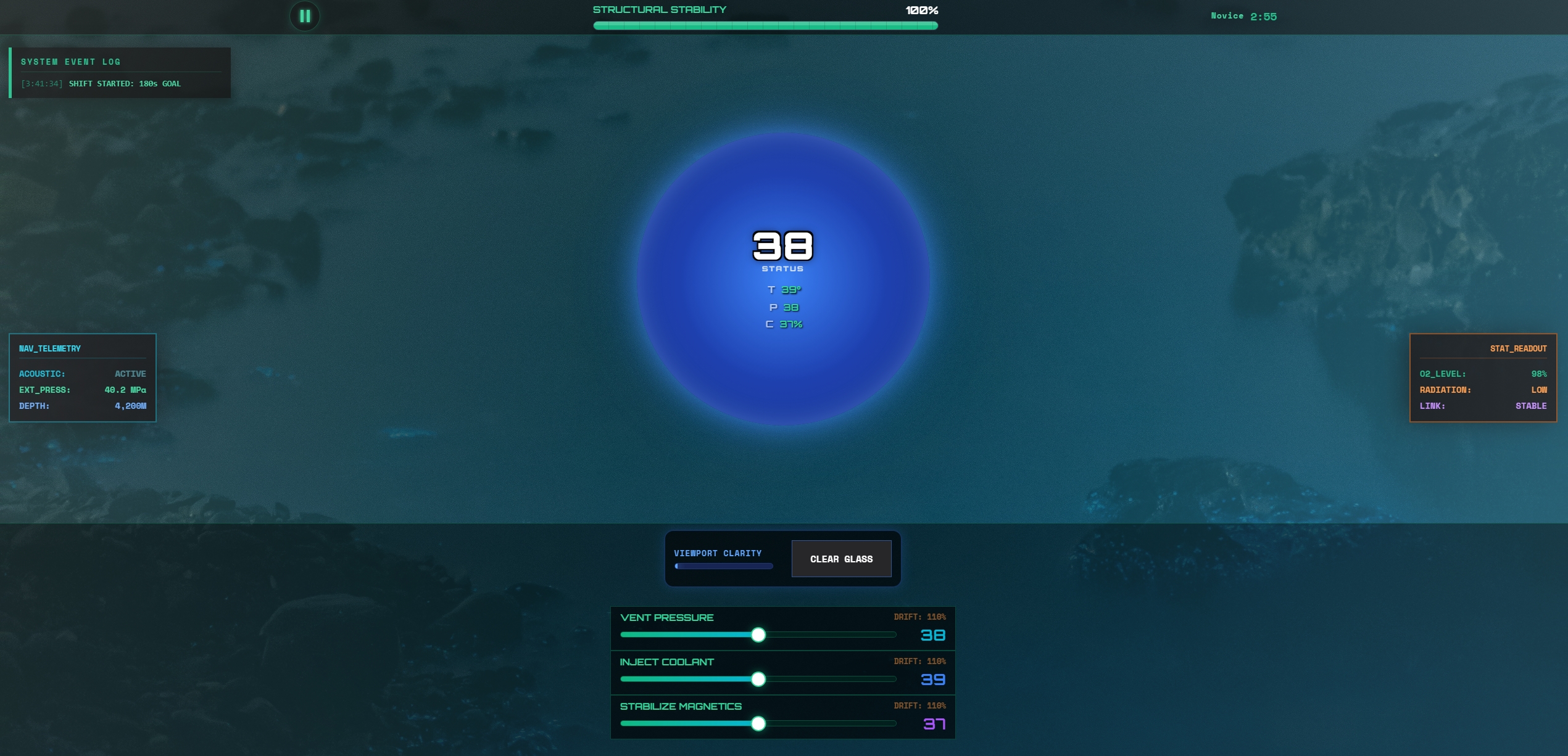 You are the lead engineer on Deep Stoker Unit 4, a geothermal reactor located 4,200m beneath the ocean surface. Your shift lasts 5 minutes. The hull is fracturing, the coolant is leaking, and something keeps triggering the motion sensors outside.